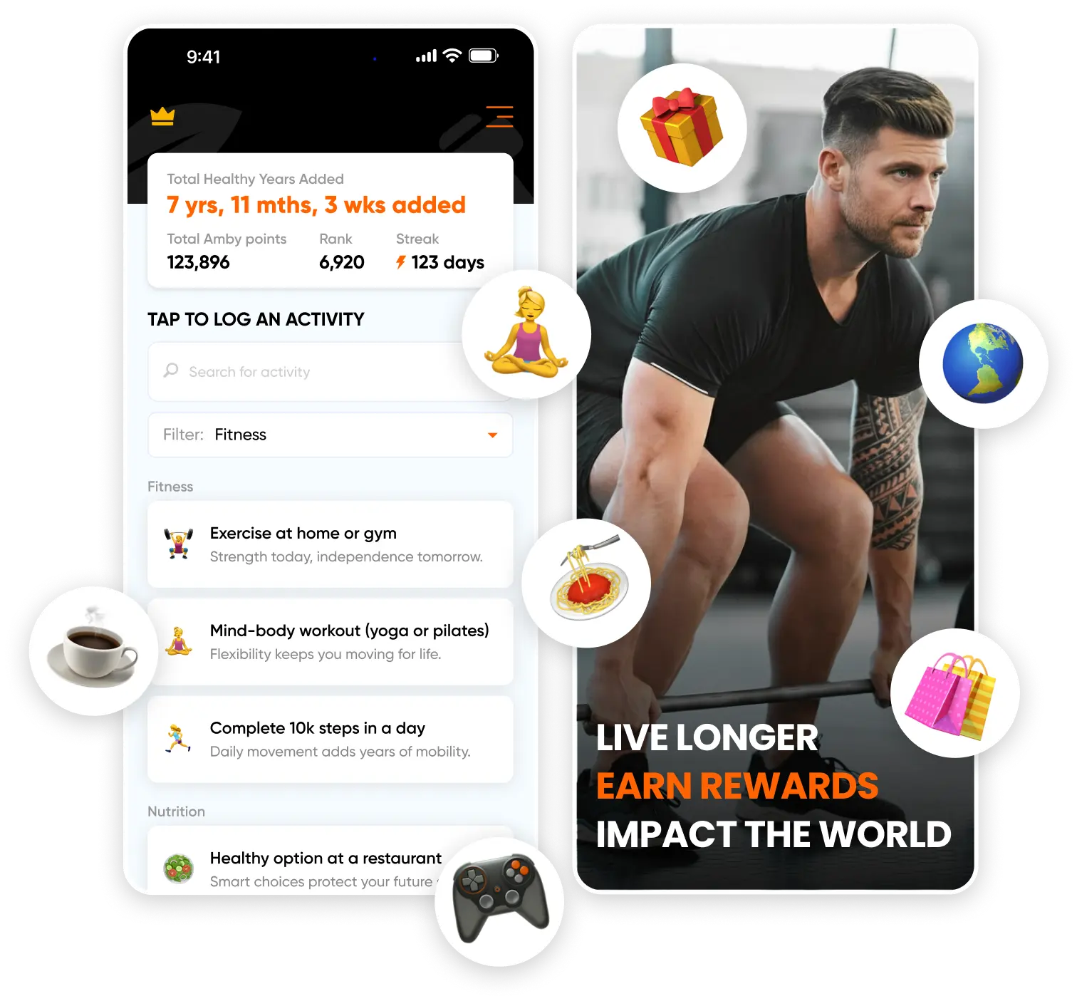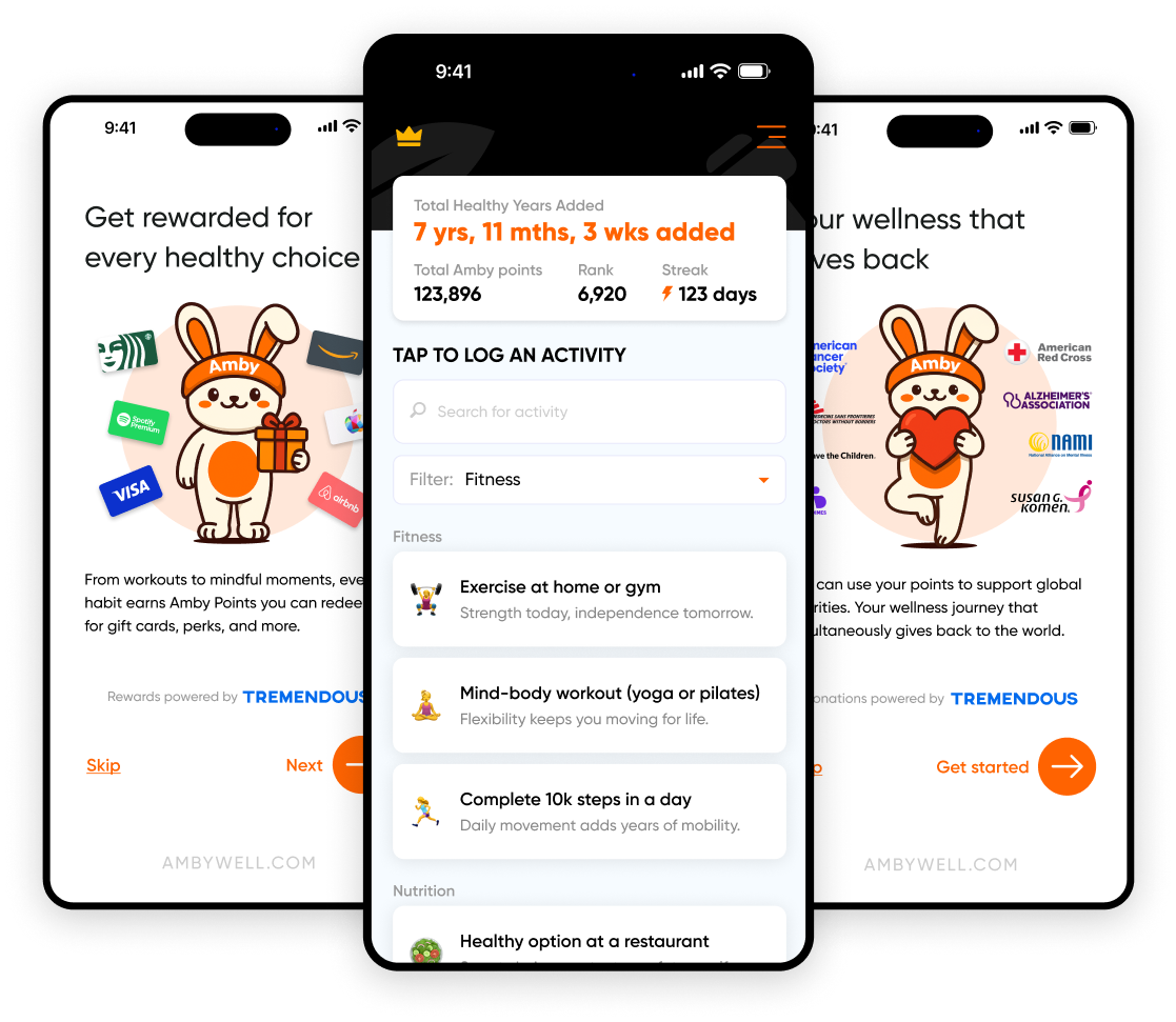 Get the Amby app and begin building better habits that help you live longer, while turning them into rewards for yourself, or others.