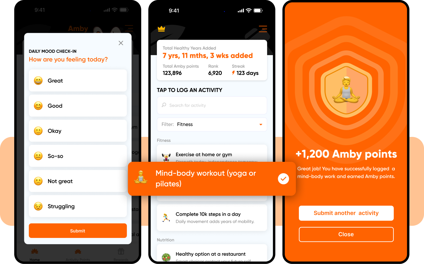 Most health apps focus narrowly on steps, calories, or meditation. Amby brings it all together with movement, nutrition, sleep, and mental well-being, the daily habits science shows help you live longer. And we reward you for sticking with it.