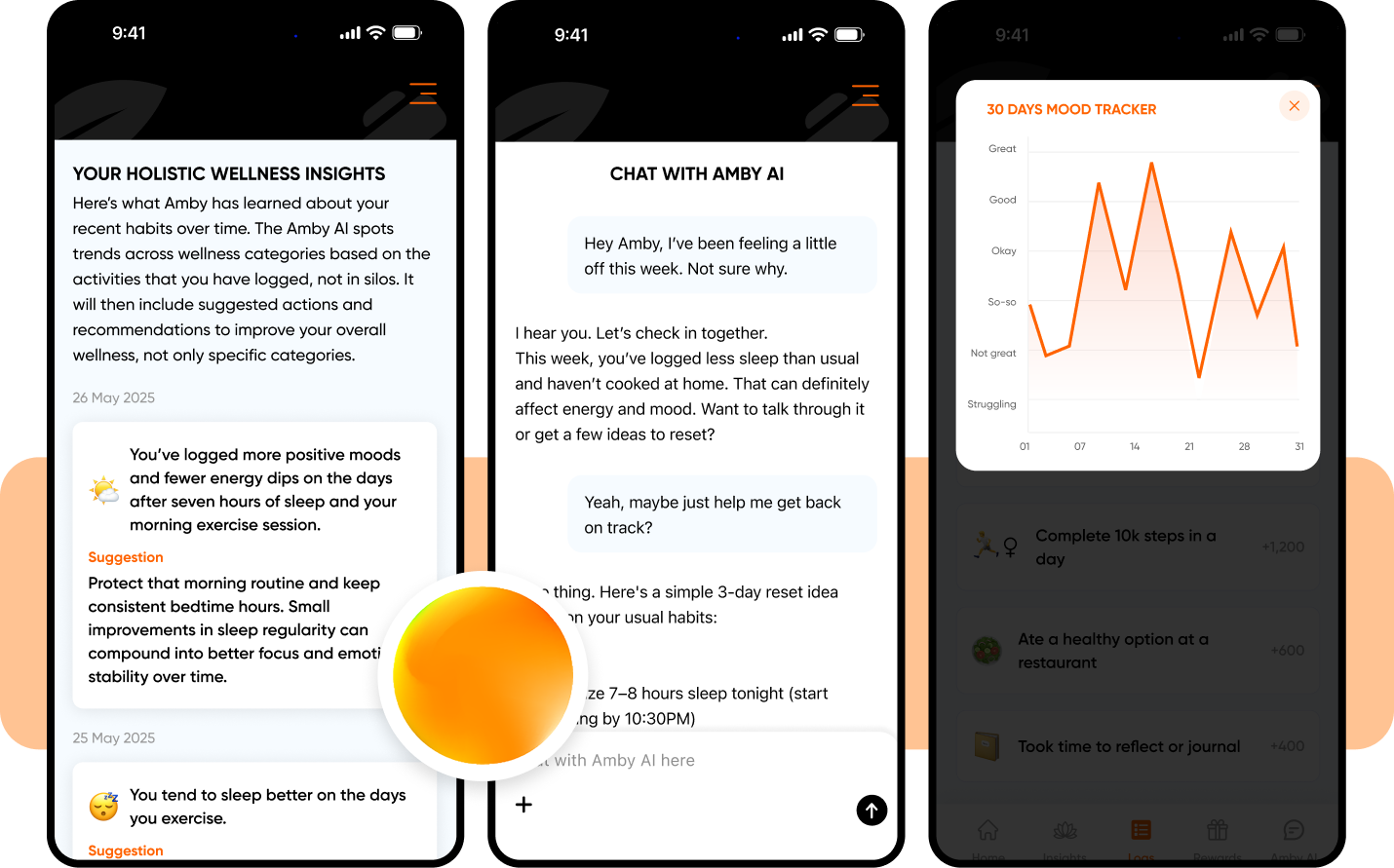 No calorie counting and no tedious forms. Just tap to log the habits that extend your healthspan: sleep, movement, mindful breaks, and nutrition. Amby makes consistency effortless so you can focus on living longer.