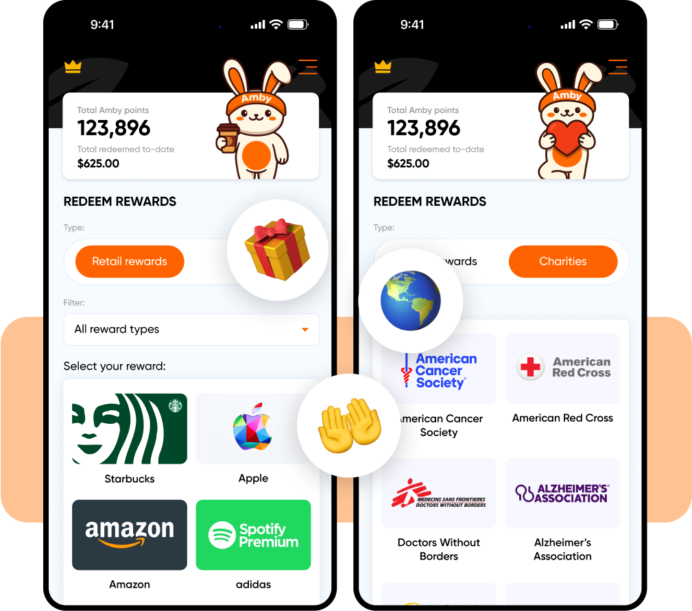 Every healthy habit adds up. With Amby, consistency earns you points you can redeem for gift cards or donate to charities advancing health and longevity. Even by sleeping 8 hours, you’re investing in more years for yourself and others.